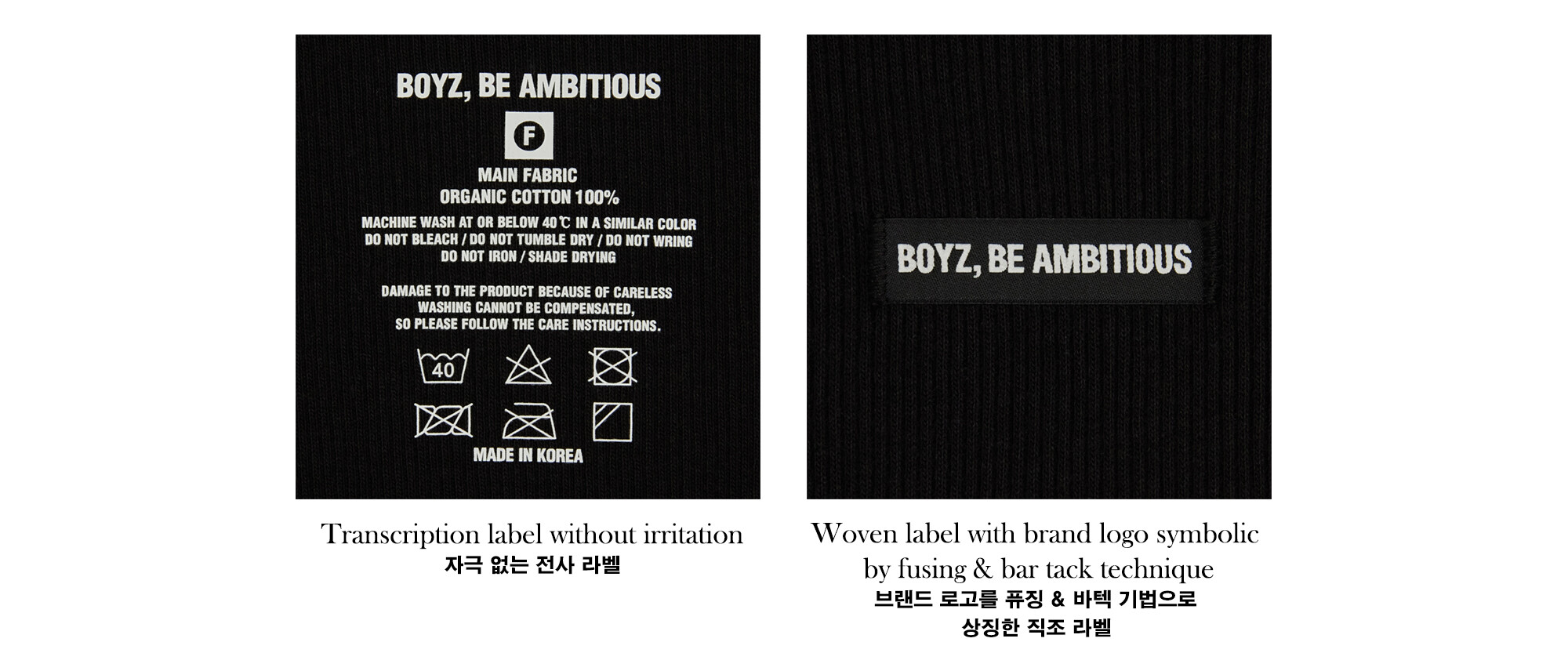 브랜드 로고를 퓨징 & 바텍 기법으로 상징한 직조 라벨